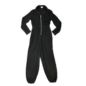 SUPERDOWN JAZMIN ZIP UP JUMPSUIT WOMENS S SMALL BLACK BELTED WAIST ELASTIC LEG