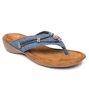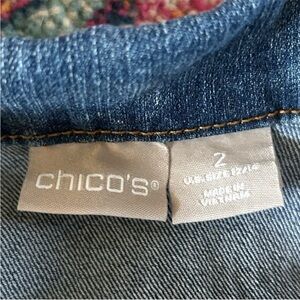 Chico's denim jacket with button front. Medium blue hue. Classic collar and pockets.