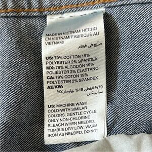 Chioc’s | Women’s medium blue denim button front jean jacket. Long line silhouette, long sleeves, side pockets, fold down collar. Cute! Machine wash cold, 79% cotton, 19% polyester, 2% spandex. Women’s size 12-14