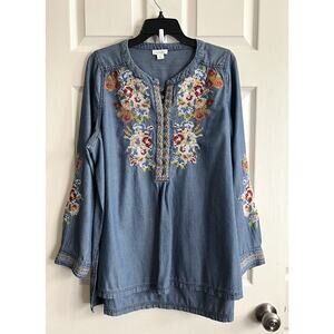 SUNDANCE Kenza Floral Cross Stitch Embroidered Chambray Striped Tunic Blouse L
