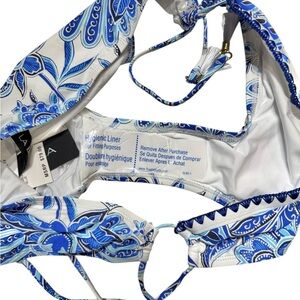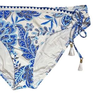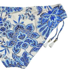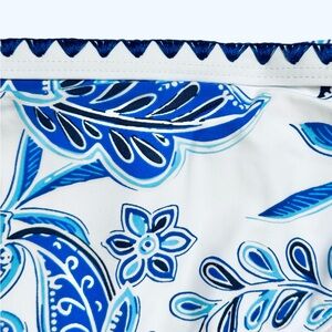 Dive into a captivating swim collection adorned with a stunning blue and white multicolored floral pattern, blending the beauty of ocean waves and blooming flowers. The blend of these cool tones on this hipster bottom evokes a sense of tranquility and elegance, making it an ideal choice for those seeking a sophisticated and stylish beachwear option.