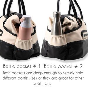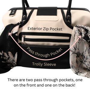 Borsali Duffle for travel. This Duffle practically travels by itself! The Travel Wallet fits inside the bag or can be securely attached inside one of the exterior pockets when you need constant access to your travel items. The interior is wide open large enough for a 16" laptop, 3 custom packing cubes a toiletry bag and a pair of shoes. Use it for a quick weekend or keep you necessary items on hand during flights. Fits easily in both the overhead compartment and under most airline seats. The handles, trolley sleeve and crossbody strap give you 3 ways to carry the bag. Two large exterior pass through pockets hold large scarves, glasses case charging cords or anything you need at your fingertips. Two water bottle pockets hold your beverage and an extra one for a long flight. There is even a small zippered pocket on the outside for extra security. Cream vegan leather.