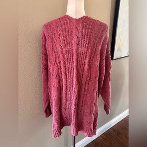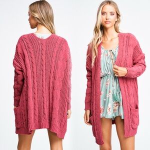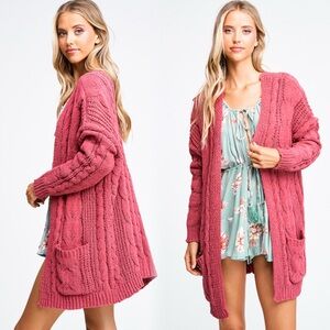 Gorgeous and super soft chenille cable knit open front sweater in rose pink.