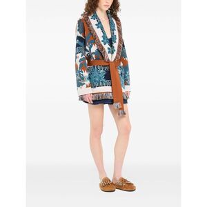 red earth and teal blue floral print fringed trim geometric pattern open front includes belt Island Soul wool cardigan