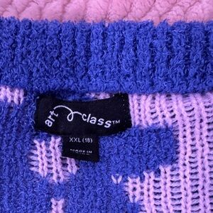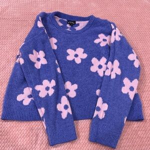 Charming floral sweater with a cozy crew neck. Features a vibrant blue base with pink flowers. Perfect for a stylish look.