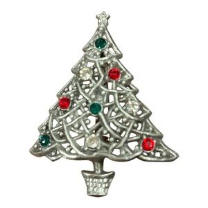 Tags: vintage, brooch, Christmas, tree, holiday, gold tone, pewter, rhinestones, open work, metal, collectible, festive, sparkling, winter style, giftable, filigree, scalloped