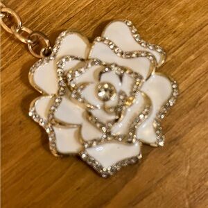 This gold tone key chain has a large white rose with rhinestones. It has a large lobster claw closure as well as a key ring. It is 4 1/2 inches long with a 4 link chain. It is 1 1/2 inches long and 1 3/4 inches wide. Bx3