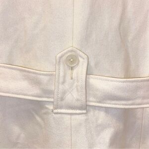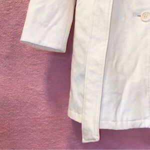 Look sleek and chic while wearing this cream white tie-waist coat by Merona. This glamorous trench coat is the perfect neutral piece to add to any wardrobe! The inner lining of water-resistant purple polka dot and white pattern is the perfect pop of color to this contemporary closet piece. Perfect if you’re looking for an all white Christmas fashion look and/or a sultry spring time jacket! Please review all pics/description prior to purchase, all sales final. Pair this coat with your favorite trousers and blouse; dress and heels; or keep it sweet and simple with a mini skirt with tights and flats.