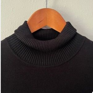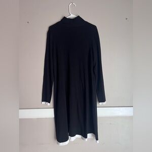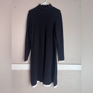 Stylish black dress with white hem. Long sleeves and turtleneck design. Perfect for versatile wear.