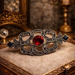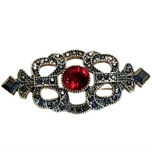 Vintage Late 70's Silver Tone Crystals Red Ruby Crystal Victorian Style Brooch
