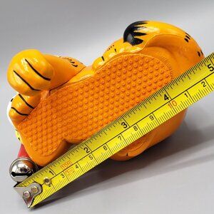 1. The Enesco Stocking Hanger does not have the original box. Garfield's left arm extends approximately 1-1/2" below the base and forms a hook to hang stockings or other decor. It measures approximately 3" tall, 5" long, 3" deep and has a bell at the end of the red stocking cap.