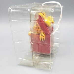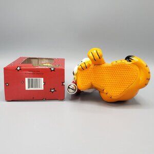 2. The 2003 Collectible Ornament from Macy's is in its original box and has not been removed from the plastic packaging. It features Garfield peeking out of a red gift box and has a white hanging string. The ornament measures approximately 2-3/8" tall, 1-1/4" wide, 1-1/4" deep.