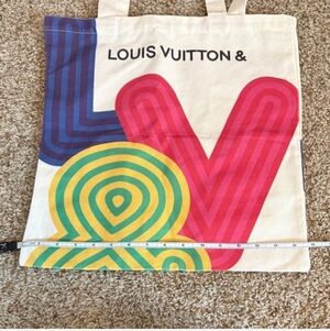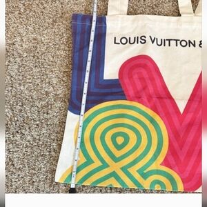 This Louis Vuitton tote bag showcases a modern artistic design on a white canvas, featuring playful and colorful elements. With its minimalist structure and white straps, it offers a chic and contemporary look, perfect for any occasion.