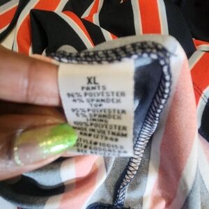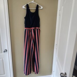 Emma & Michele Red & Blue Striped Jumpsuit with Navy Blue Top. Sleeveless.