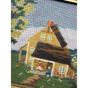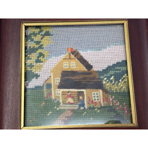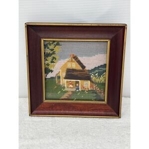 VTG Framed Needlepoint Art House Porch Cottagecore Decor Early American