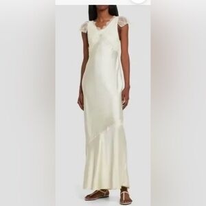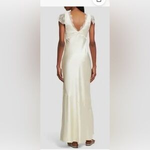 Keywords: maxi slip dress, lace trim dress, sleeveless gown, wedding guest dress, party dress, evening dress, formal dress, elegant dress, satin dress, lace detail, long dress, v-neck dress, white dress, cream dress, maxi dress, Las Vegas, modern royalty, formal, fancy, rich, designer, old money,