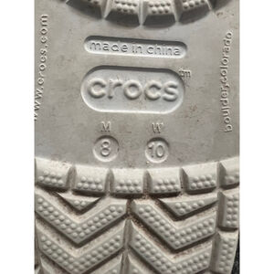 These are a pair of pre-owned Crocs Classic Clogs in a silver glitter finish. The clogs feature the iconic ventilation ports on the upper and a movable heel strap with the "CROCS" brand name embossed. The Crocs logo is visible on the side buttons and the footbed. The outsoles are textured for grip and clearly show "made in china," "crocs," and sizing "M 8 W 10," indicating a women's size 10. Some minor wear and dirt are visible on the soles and footbeds.