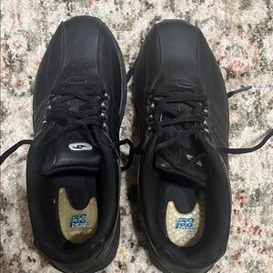 Sleek black sneakers with cream laces. Size 9. Comfortable and stylish for everyday wear.