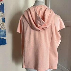 New with tags, Calvin Klein Performance Short Sleeve Sweatshirt with CK Logo across the front. This adorable peach color sweatshirt has a drawstring hood.