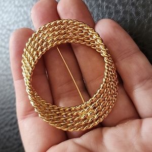 Elegant gold toned vintage Monet brooch with a bamboo-inspired design. Perfect for adding a touch of sophistication to any outfit. Approx 2" in diameter- does show some age related wear (few tiny spots of flaking- primarily on raised edges- see pics closely)- price reflects condition