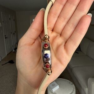 Notable design details include red cabochon stones on the pushers and a beige/ivory leather strap.