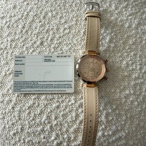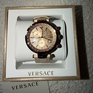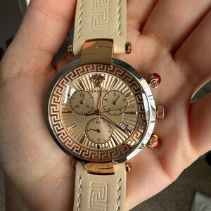 Sophisticated Versace watch in rose gold. Features intricate chronograph design. Perfect for stylish occasions. This watch features a 41mm stainless steel case with rose gold-tone accents and an ivory dial.