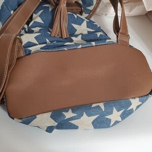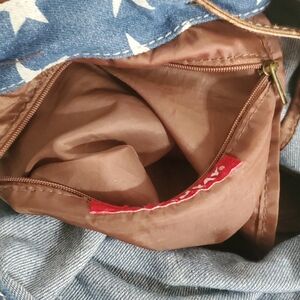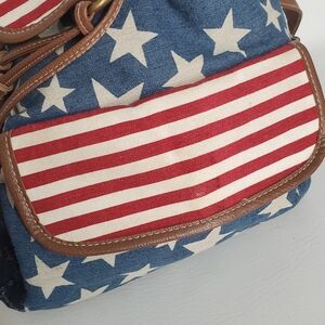 Show off your style with this patriotic star and stripe backpack. Perfect for any occasion, this bag features a bold red, white, and blue design with brown accents. Ideal for those who love a unique and eye-catching accessory.
