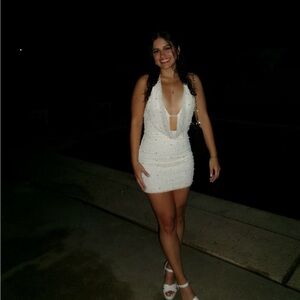 Oh Polly Versailles white halter mini dress with a deep neckline. Perfect for wedding events! Worn only once!