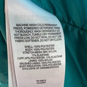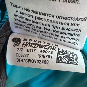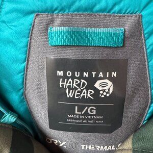 In Excellent, Very Lightly Worn Condition! Green and Tan Striped Mountain Hardwear Barnsie Jacket in Women's Large - Ski all over the mountain in style with the Women's Barnsie Jacket by Mountain Hardwear. Its Dry.Q Core shell provides reliable waterproof, breathable protection, and Thermal.Q Elite feels like lightweight and lofty down even though it's a protective synthetic insulation. Mountain Hardwear insulated the hood for extra coziness, and the PU zippered chest pocket protects your valuables from wet weather. Just don't forget to strap up the storm flap when Mother Nature starts to flex her muscles.This Fabulous Jacket was literally worn one weekend at the mountain - Warm, Trendy and Cozy. There are two tiny white specks at the left shoulder.