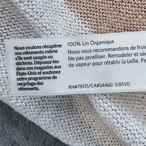 Keywords: Eileen Fisher, knit sweater, tunic, striped, beige, white, crew neck, pockets, linen blend, lightweight, casual, minimalist, oversized