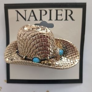 Yee-haw! This brand-new, signed cowboy hat brooch from Napier is solid and beautifully made in textured goldtone metal with turquoise stone accents in the hat band. Would look perfect on a denim jacket or on a hat!