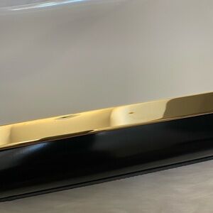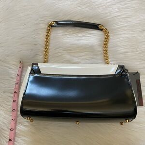 This stylish shoulder bag features a sleek black and white design with luxurious gold accents. Perfect for any occasion, it combines elegance with functionality.