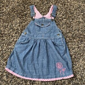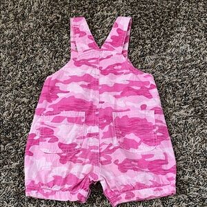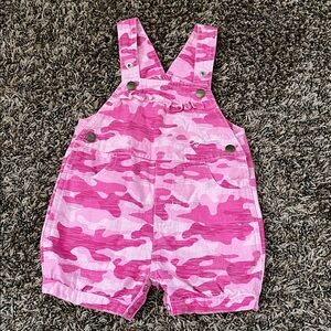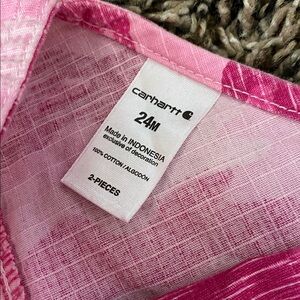 Size 24 months/2T, both are Carhartt. One is a denim jumper and one is pink camo shortalls
