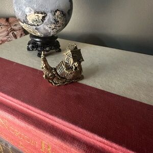 Unique brass snail mini figurine with a smiling character face holding a cane, a small house on its shell with a little creature peeking out and other intricate details. 1.5” tall and wide. Collectible piece with unique features. Comes in a little box with tissue paper.