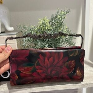 In great condition as shown. Patricia Nash Leather Wallet in deep tone of red/Burgundy. Elegant floral wallet with striking silver accents. Perfect for evening outings.