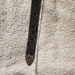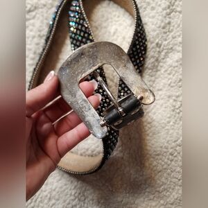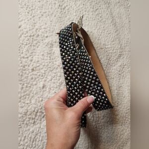 Add a touch of elegance to your outfit with this stunning black and silver embellished belt. Perfect for any occasion.