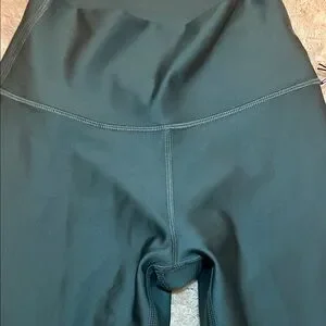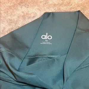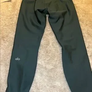 Stylish Alo high-waisted leggings in a sleek dark green color. Perfect for workouts or casual wear.