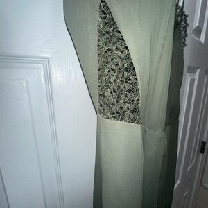 The River jumpsuit in khaki is tailored to a sleeveless, short silhouette. It’s detailed with an asymmetric shoulder that seamlessly wraps to an open back with lace detailing. Imitate the simple silhouette throughout your outfit with simple heels and a cover-up.