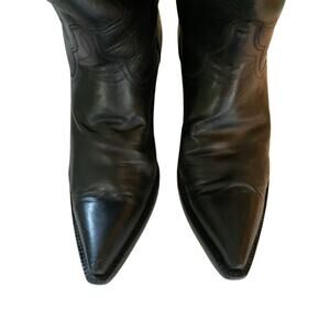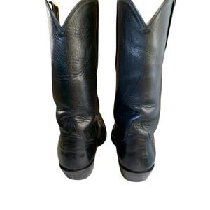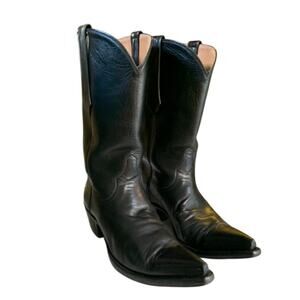 These boots are the cowboy boot equivalent of the little black dress. They have super soft and luxurious black buffalo calf vamps and uppers. The only decorative stitching is a star on the inside & outside of ankle. Vibram soles, lined in glove soft leather.