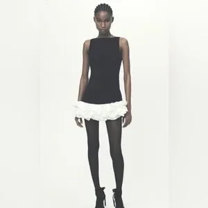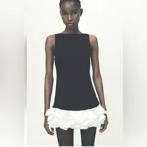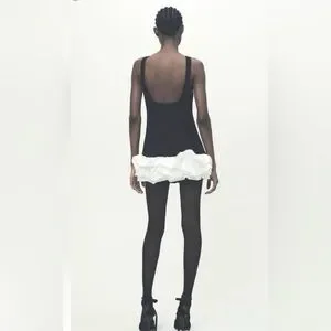 Stylish mini dress with bold black and white contrast. Features a unique ruffle hem. Perfect for a chic look.