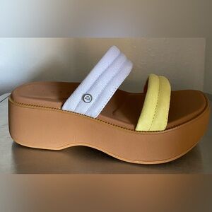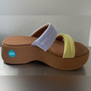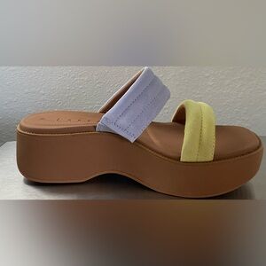 these chic platform sandals. Featuring a vibrant yellow and lavender design, these shoes are perfect for any casual outing.