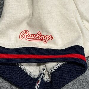 Awesome vintage Atlanta Braves baseball jersey from the 1990s, manufactured by Rawlings. This is a classic piece of MLB history with the iconic "Braves" script logo and tomahawk emblem.