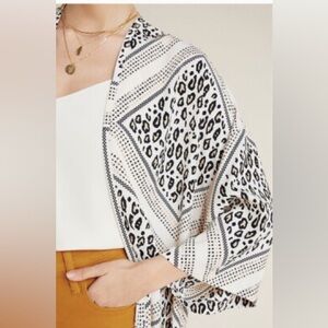 Chic kimono with bold black and cream leopard pattern. Easy to layer. Would be beautiful with a black slip dress or even a turtleneck and pencil skirt.