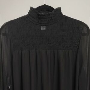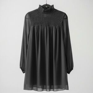 Elegant, flowy sheer dress with built in slip. Features a turtleneck and long balloon sleeves. Hem falls right above the knee. Ideal for any occasion. Effortlessly chic.
