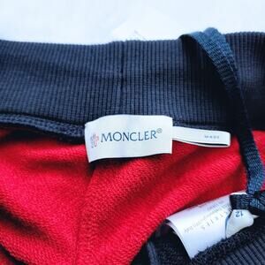 These Moncler Boys’ Color Block Sweatpants bring athletic edge and luxury design together in a striking color block style. Crafted in Italy, the pants feature bold panels of red, navy, and white, accented with the iconic Moncler logo patch on the hip for instant brand recognition. The ribbed black waistband and cuffs provide a snug yet comfortable fit, while the contrast side stripes emblazoned with "MONCLER" add a sporty finish. The cotton-blend construction ensures breathability and ease of movement, making them ideal for both casual wear and active days.