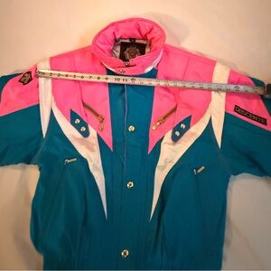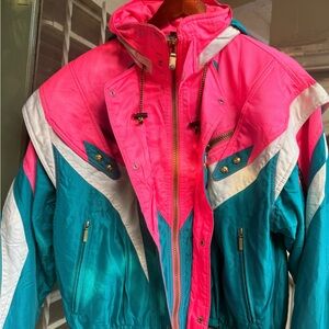 Stylish vintage pink ski jacket by Descente. Features bold design, insulation, hood in collar, flared shoulders and quality craftsmanship. This may be the best retro women’s ski jacket out there! Forget about Tipsy Elves, be original with this timeless piece. 🤘🏽🪩