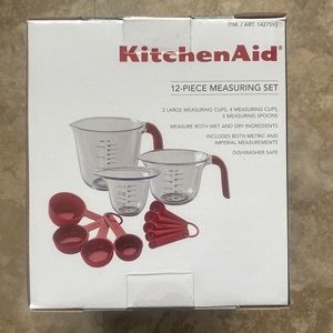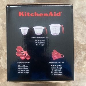 New in box. Factory sealed. Comes with three large measuring cups four measuring cups and five measuring spoons. Measures both wet and dry ingredients. Includes both metric and imperial measurements.