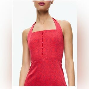 This striking red jumpsuit by Alice + Olivia features a sophisticated halter neckline and a wide-leg silhouette, perfect for making a bold statement at any special occasion. The smooth fabric drapes beautifully, offering a flattering fit that exudes elegance and style.