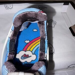 Fun Hello Kitty design on blue sneakers. Comfortable and stylish for kids.