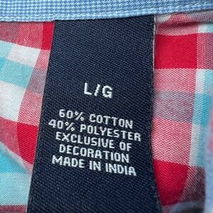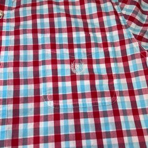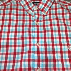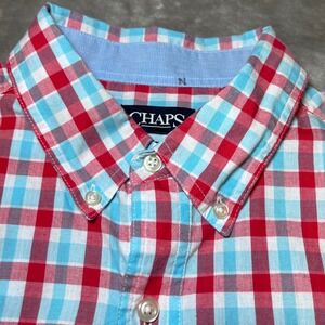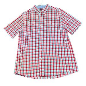 Chaps Button Down Shirt Mens Large Red Blue Plaid Easy Care Short Sleeve Preppy